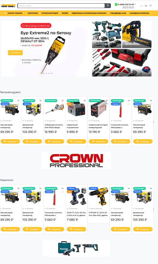 Сайт good-snab.ru - интернет-магазин, специализирующийся на комплексном снабжении строительных площадок и бригад по всей России. Разработан на платформе 1С-Битрикс:Управление сайтом, редакция «Бизнес», что обеспечивает стабильную работу, безопасность и удобство управления контентом, потенциал масштабирования.